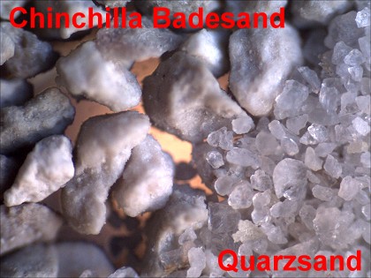 Quarzsand kann man relativ gut von normalen Chinchilla Badesand unterscheiden. Einige Anbieter bieten bewusst Quarzsand als Chinchilla Badesand oder Chinchilla Spezial Sand an, da der Quarzsand wesentlich billiger ist! Aber wie gesagt Quarzsand schädigt das Chinchillafell. Vogelsand ist ebenfalls Ungeeignet für Chinchillas, dieser besteht auch meistens aus Quarzsand.
